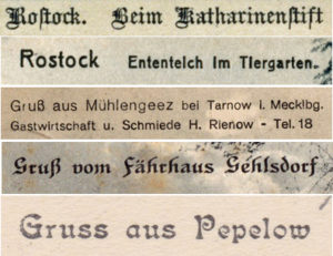 Schrifttypen auf Ansichtskarten um 1910. Oben eine Bildunterschrift der Heimatschutzserie, darunter andere Beispiele aus Rostock und Mecklenburg. Nachdem zu Beginn des 20.Jahrhunderts sehr häufig weiche, rundliche Schrifttypen verwendet wurden (2. von oben), fanden um 1910 sehr unterschiedliche Typen Anwendung.