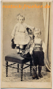 12 Die beiden abgebildeten Kinder sind namentlich nicht bezeichnet. Da das Bild auf der gleichen Seite wie das von Meta von Roeder eingesteckt ist, liegt der Verdacht nahe, dass ein Bezug zu ihr besteht. Auf dem Gürtel des neben dem Stuhl stehenden Kindes ist ein Name eingestickt: Rixi(?) von Roeder. Die beiden Kinder könnten Heinrich Emil (*1857) und Max Carl Heinrich von Roeder (*1858) sein.