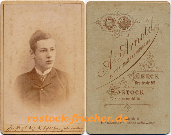 Atelierwerbung auf einem Kabinettbild. Unter A. Arnold der Hinweis auf den neuen Inhaber. In der Mitte sind die Ehrungen aus Stolp und von der Rostocker Gewerbeausstellung zu sehen.