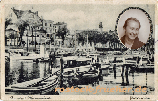 Um 1930 stand anscheinend ein Fotoautomat der Firma „Photomaton“ in Warnemünde. Die erste Automatenkabine war vier Jahre zuvor in New York aufgestellt worden. Die oben abgebildete Ansichtskarte hat in der Mitte des rechten Randes eine Öffnung, wo das Passbild einzustecken war, das zuvor am Automaten aufgenommen wurde.