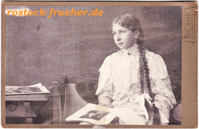 Zur Fotografin ist mehr bekannt. Marie Schützmann (*1856) war die Tochter von August Lehmann, der mit hoher Wahrscheinlichkeit jener Herr ist, der das Bild darüber gemacht hat. Marie heiratete 1874 den Fotografen Adalbert Schützmann, der von 1874 bis 1889 in Schwerin ein Atelier betrieb. Zu Beginn des 20. Jahrhunderts 1900 lebte Marie als Fotografin in Gadebusch.