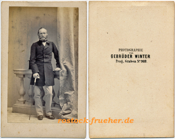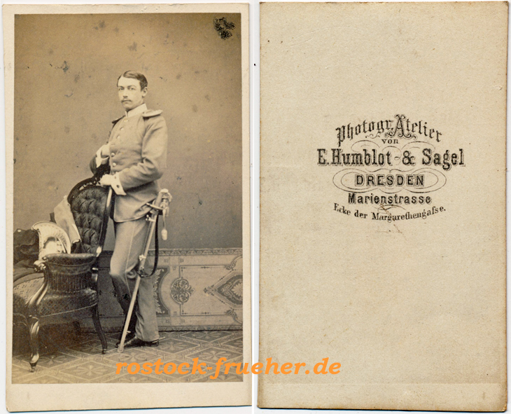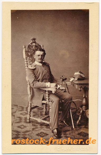 20 Maria Alison Clauss geb. von Raysky (*1805 †1888) Foto: Brockmann, Dresden21 Heinrich Leo von Raysky (*1803 †1878), war Offizier im Dienst des österreichischen Militärs. Foto: Gebrüder Winter, Prag22 Minna Pompilia von Raysky (*1809 †1879) Foto: Brockmann, Dresden23 Beate Toinon von Jena, geb. von Raysky (*1804 †1882) Foto: Schwartz, Berlin24 Julius Wolf von Lindenau (*1799 †1867), Königlich Sächsischer Hauptmann und Kammerherr Foto: anonym, wahrscheinlich Hahn. Der Teppich ist identisch wie in Abb. 25, jedoch seitenverkehrt.25 Hugo Wolf von Lindenau (*1828 †1900), Königlich Sächsischer Legationsrat, Sohn von Julius Wolf von Lindenau Foto: Hahn, Dresden26 Freiherr Victor von Ferber (*1809 †1897). Victor von Ferbers Mutter war wahrscheinlich Marie Henriette Viktoria von Ferber geb. von Broizem. Foto: Hahn, Dresden27 Rosalie Freiin von Pfister (*1816 †1868) heiratete 1836 Victor von Ferber. Nach dem Tod des Vaters Georg von Pfister (1846) erwarb Victor von Ferber das Rittergut Ragewitz und Grubnitz. Foto: Hahn, Dresden28 Auguste Gräfin von Harrach (* 1800; † 1873) war als Fürstin von Liegnitz die zweite Ehefrau von König Friedrich Wilhelm III. von Preußen. Die aus dem österreichischen Adelsgeschlecht Harrach stammende Auguste war die Tochter von Graf Ferdinand Joseph von Harrach zu Rohrau (1763–1841) und der Christiane Freiin von Rayski (1767–1830). Foto: F. Randegger, Vevey29 Karl Philipp Graf von Harrach zu Rohrau und Thannhausen (*1795 †1878), Bruder von Auguste von Harrach.30 Isabella von Harrach geb. von Pfister (*1812 †1896), Schwester von Rosalie von Ferber geb. von Pfister. Isabella von Harrach war die zweite Ehefrau von Karl Philipp von Harrach.Maria Anna von Harrach geb. Sauermann (*1800 †1879) war die zweite Frau Ferdinand Joseph von Harrach (*1763 †1841), dem Vater von Auguste und Karl von Harrach. Die Hochzeit fand nach 1830 statt. Maria Anna von Harrach war jünger als ihr Stiefsohn Karl und gleichaltrig mit Auguste. Foto: Hahn, Dresden32 Ferdinand Graf von Harrach (*1832 †1915) war Landschafts-, Historien- und Porträtmaler. Er war der Sohn von Karl Philipp von Harrach aus dessen erster Ehe. Foto: Frisch, Weimar33 Ferdinand Graf von Harrach Foto: Schwartz, Berlin34 Benannt als Graf Karl Harrach. Foto: Schwartz, Berlin35 Adalbert Ferdinand Alexander von Tempsky (*1807 †1850) war in Diensten der preußischen Armee und Königlich Preußsicher Kammerherr. Über den Sohn Georg ist mir nichts bekannt. Reproduktion aus den 1860er Jahren einer früheren Fotografie.36 Marie von Tempsky geb. von Broizem (*1807 †1868) war die Ehefrau von Alexander von Tempsky. Foto: R. Eich, Dresden37 Anna von Tempsky, vermutlich eine Tochter von Marie und Alexander von Tempsky. Rückseitig eine Widmung an Onkel Eduard (von Broizem?)38 Alexander von Miltitz (*1803 Siebeneichen bei Meißen †1870er Jahre) Foto: Hahn, Dresden39 Georg von Miltitz (*1802 †1874) war ein Bruder von Alexander von Miltitz. Von 1820 bis 1832 im Dienst der Sächsischen Armee, zuletzt als Premier Leutnant, lebte danach als Rittergutsbesitzer und Braunschweigischer Kammerherr auf Siebeneichen40 Richard Freiherr von Friesen (* 1808 † 1884) war von 1849 bis 1852 Innen-, von 1858 bis 1876 Finanz-, von 1866 bis 1876 Außenminister sowie von 1871 bis 1876 Vorsitzender des Gesamtministeriums (Regierungschef) des Königreichs Sachsen. Foto: Hanfstaengl, Dresden41 Johann Paul Freiherr von Falkenstein (*1801 †1882) war von 1853 bis 1871 Kultusminister sowie von 1866 bis 1871 Vorsitzender des Gesamtministeriums (Regierungschef) des Königreichs Sachsen. Foto: Hanfstaengl, Dresden42 Henriette Constanze von Falkenstein geb. Gruner (*1806 †1886), Ehefrau des Ministers Falkenstein Foto: Hanfstaengl, Dresden43 Friedrich Georg von Winkler (*1801 †1884), Königlich Sächsischer Geheimer Regierungs-Rat Foto: Hanfstaengl, Dresden44 Marie Anna von Winkler geb. von Egidy (*1805 †1877), heirate 1828 Friedrich Georg von Winkler Foto: Hanfstaengl, Dresden45 Benannt als Frau von Thümmel geb. von Winkler, vermutlich eine Tochter von Friedrich Georg und Marie Anna von Winkler Foto: Hanfstaengl, Dresden46 Elisabeth von Kuntzsch (*1841 †1903) heiratete 1869 Gunther Friedrich von Berg. Foto: Hanfstaengl, Dresden47 Bezeichnet als: Rittmeister von Kuntzsch. Vermutlich Oskar Joachim von Kuntzsch, um 1820 im Dienst der Sächsischen Armee, Vater von Elisabeth von Kuntzsch. Foto: Hahn, Dresden48 Paul Adolph Benno von Heynitz, in den 1850er und 1860er Jahren im Dienst der Sächsischen Armee, im Jahr 1860 Leutnant im Garde-Reiterregiment Foto: Humblot & Sagel, Dresden49 Bezeichnet als: Matinka (?) von Heynitz Foto: Hahn, Dresden50 Otto Ernst von Berlepsch (*1828 †1870), 1870 Hauptmann der 7. Compagnie des Leib-Grenadier-Regiments der Sächsischen Armee, fällt im Deutsch-Französischen Krieg51 Hermann Otto Platzmann (*1830 †1889) war Offizier, verließ als Major die Armee, danach Gutsherr auf Oberlichtenau bei Pulsnitz. Foto: Hahn, Dresden52 Amalie Auguste Prinzessin von Bayern (* 1801 † 1877 ) war ab 1854 Königin von Sachsen. Die Aufnahme ist eine Fotomontage. Foto: Gebrüder Hallwig, Dresden53 Maria Sidonie Ludovica (*1834 † 1862), Prinzessin und Herzogin zu Sachsen Foto: Hahn, Dresden